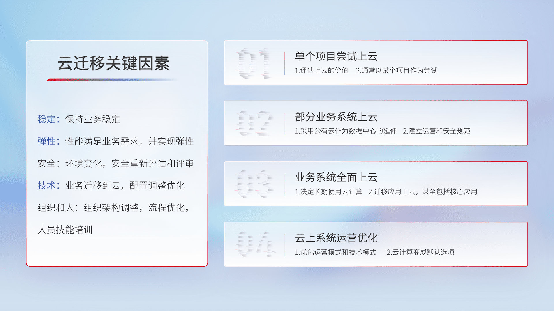 结合实际业务,,,,从规划设计、、、云平台选型、、、云原生改造、、、、数据迁移、、集成交付,,迁移全过程为客户识别最佳上云路径,,,,做好风险识别管理,,设计网络架构、、身份权限、、、、安全审计合规、、、、操作审计、、日志审计、、、监控告警策略、、、多站点容灾设计等,,,,对云上基础设施进行整体规划,,,,提升IT治理水平,,以满足弹性、、高可用、、、高性能的需求。。。。