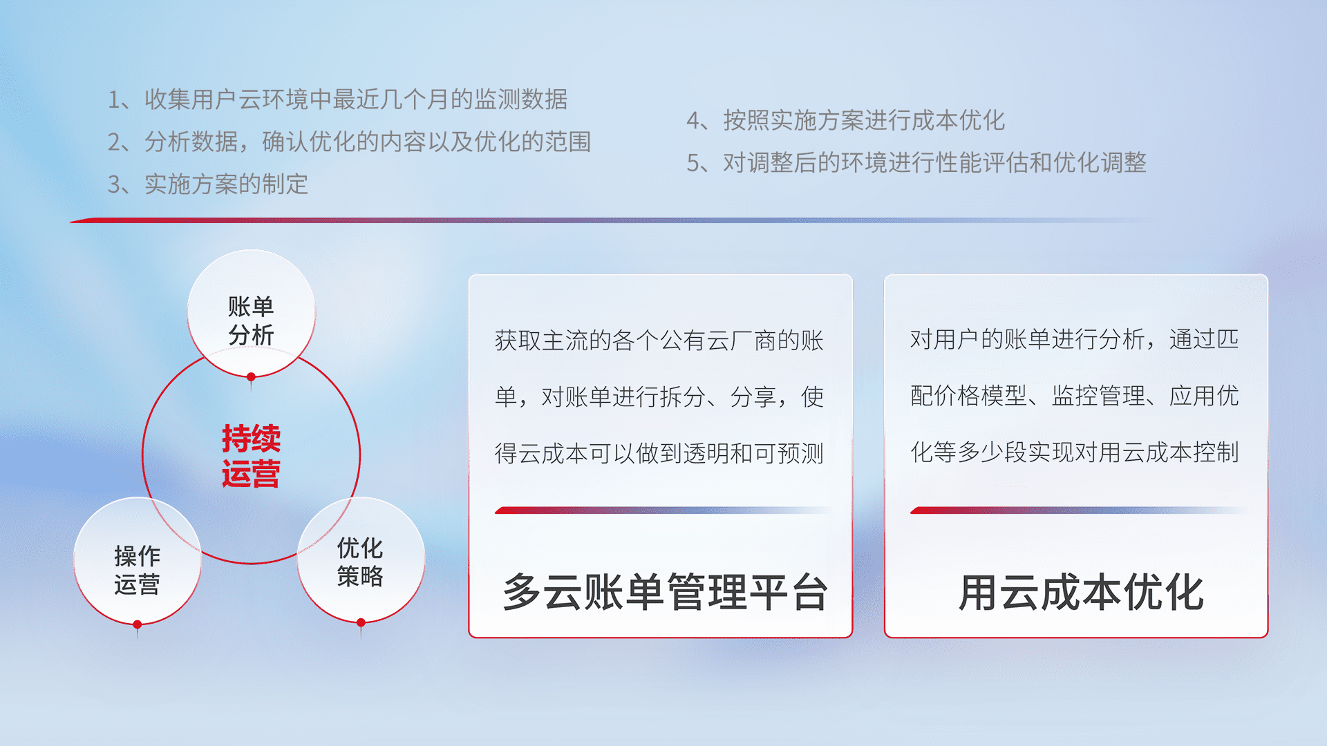 通过多云纳管,,以统一的资源数据模型把客户的云资源进行抽象和封装,,进而实现对多云资源的统一操作,,保障云资源管理的可靠性、、稳定性与可用性。。。量身定制化运维内容,,配置、、、、开发运维、、、、补丁管理、、、备份、、、、监控、、、认证和访问管理、、、、审计和日常巡检等,,,保障在用云过程中的可靠度,,,,稳定度以及高可用率。。。